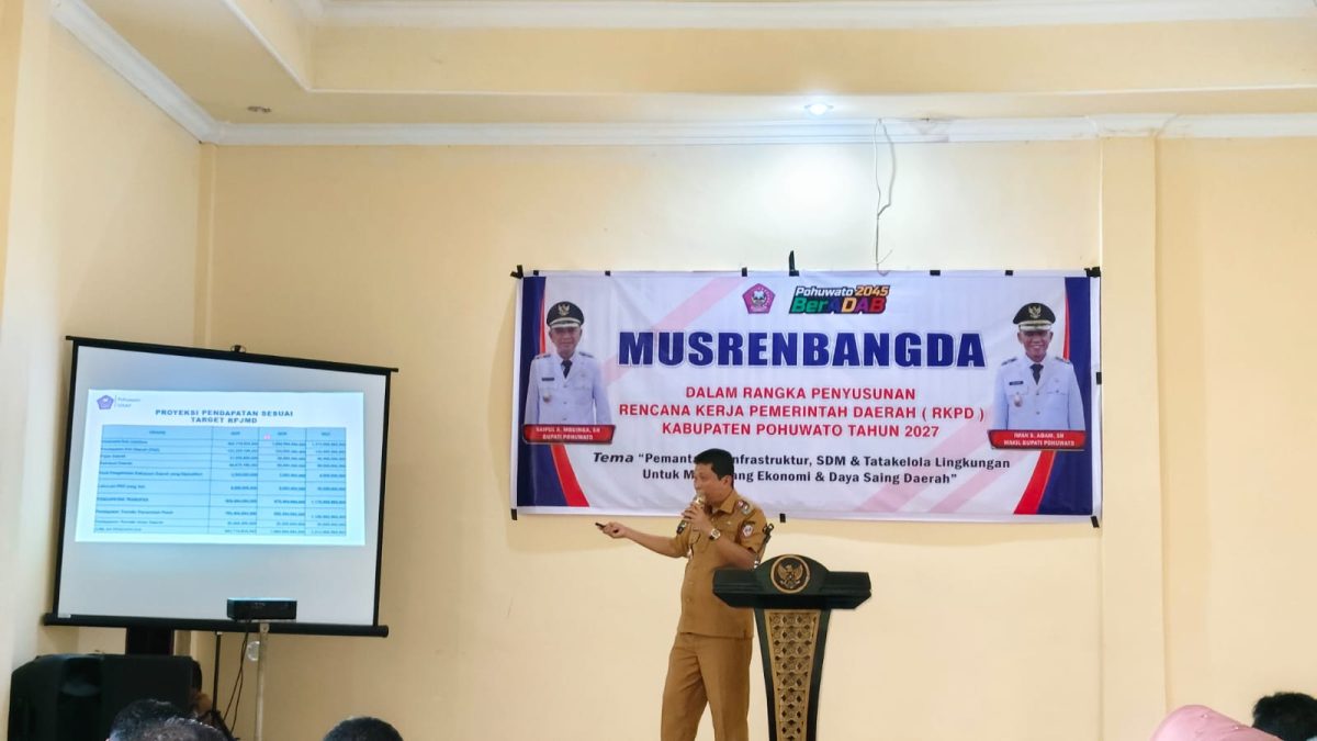 03/12/2025Pemerintah Kabupaten Pohuwato resmi menggelar Musyawarah Perencanaan Pembangunan (Musrenbang) dalam rangka penyusunan Rencana Kerja Pemerintah Daerah (RKPD) Tahun 2027. Mengusung konsep hybrid, kegiatan ini dibuka langsung oleh Bupati Pohuwato, Saipul A. Mbuinga, di Ruang Rapat Gunung Pani, Kantor Bupati, Senin (30/03/2026)